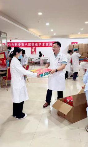 活动现场,一盒盒印有吉祥图案的红色月饼礼盒整齐摆放,张言旭主任与陈洁主任亲手将这份饱含深情的节日礼物递到每一位实习生手中。两位主任面带微笑,与实习生亲切交流,详细了解大家的实习生活情况。现场温馨有序,医护人员默契配合,确保每位实习生都能及时收到这份特别的节日礼物。