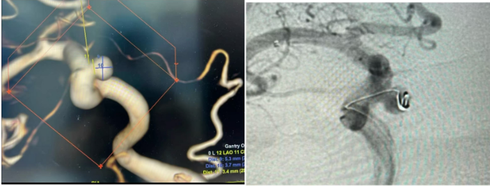 面对这一情况,郭晓宾主任团队与患者家属进行了全面、深入的沟通。基于动脉瘤的形态和位置,团队提供了两种主流的微创介入治疗方案:一是植入新型的血流导向装置(密网支架),二是行支架辅助弹簧圈栓塞术。在郭主任详细解释了两种技术的原理、优势及适应症后,家属经过审慎权衡,最终选择了技术成熟、性价比高的支架辅助弹簧圈栓塞术。