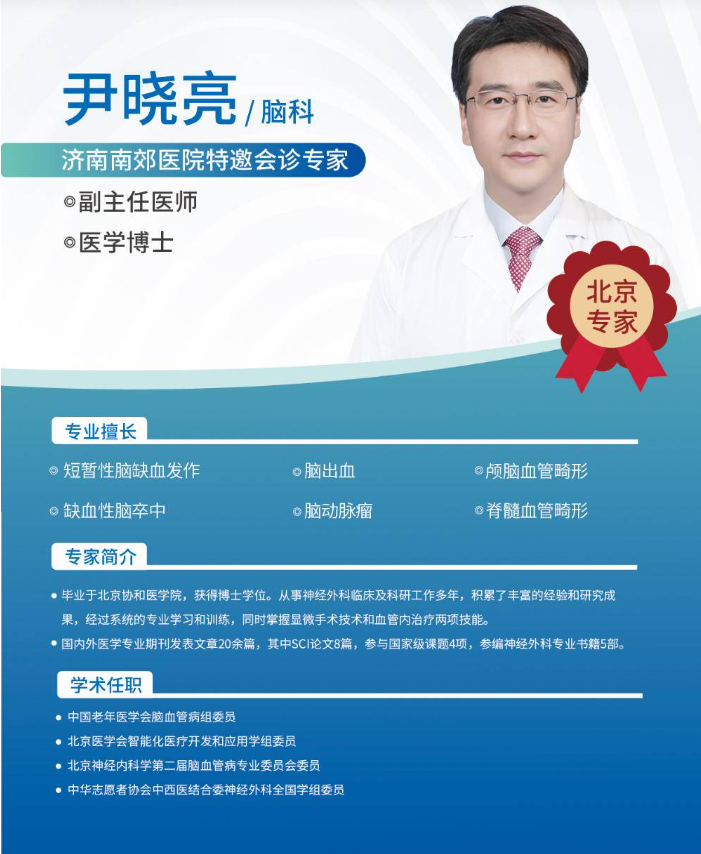 即日起,有脑科相关疾病(如头痛头晕、脑血管异常、脑肿瘤筛查等)诊疗需求的市民,可通过济南南郊医院官方电话(0531-58696666)提前咨询预约,安排尹晓亮博士会诊。医院将持续以专业与温度,为泉城百姓的“脑健康”保驾护航!