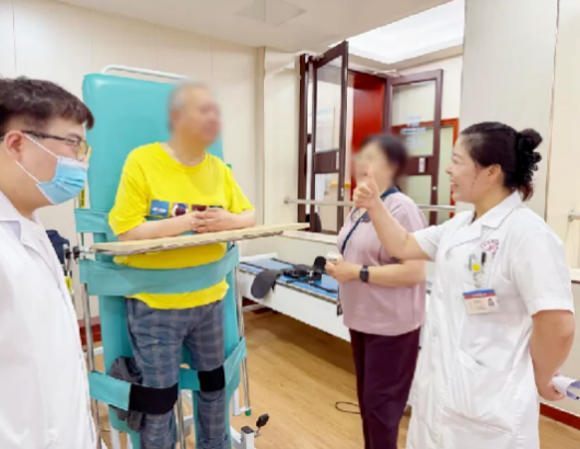 时间回溯到今年六月,这位年近七旬的老人带着沉重的病史来到这里。十四年前,他经历了脑动脉瘤和脑室腹腔分流手术,术后遗留右侧肢体活动障碍;更沉重的打击来自后来的脑梗,导致他完全丧失语言能力,无法独立站立,只能依靠器械勉强维持直立姿势。右侧肢体活动障碍如同一道无形的枷锁,将他禁锢在病榻之上,生活失去了基本的自理能力。