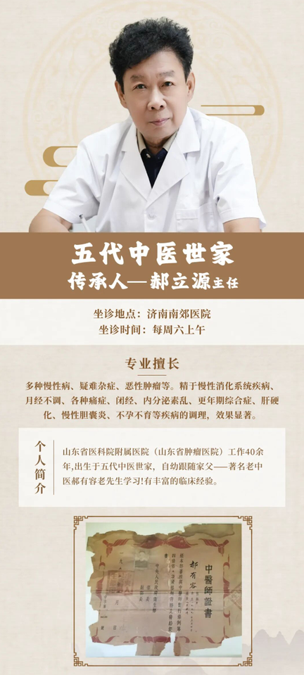 郝立源主任长期坐诊济南南郊医院中医科。如果您或家人正被上述健康问题困扰,不妨在这个时间段前来就诊,感受这位老中医四十年沉淀的精湛医术和仁心仁术。