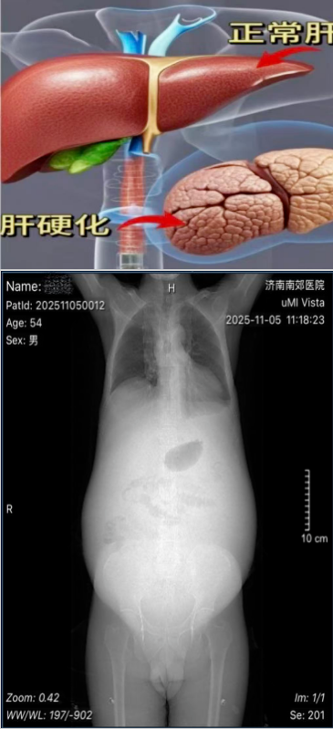 赵先生(化名)因长期饮酒40余年出现纳差、乏力、上腹隐痛、呕血,曾就诊多家医院诊断为“酒精性肝硬化、食管静脉曲张”。近一月,病情急剧恶化:腹胀如鼓、全腹胀痛,排便困难,双下肢水肿,更出现胸闷、夜间无法平卧的严重压迫症状,口服多种药物及中药未见好转。为求生机,赵先生慕名来到济南南郊医院消化科任淑红主任的专家门诊,以“肝硬化腹水”收治入院。