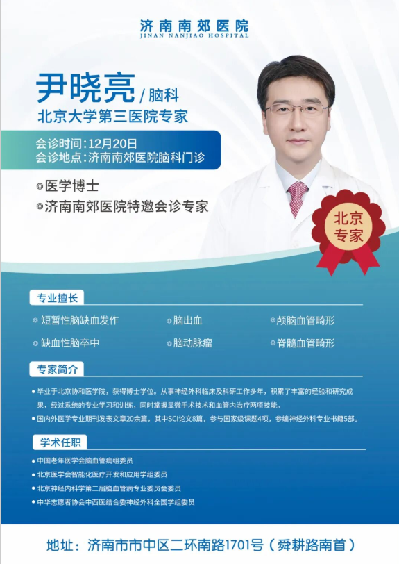 为深化脑科疑难病诊疗能力,让泉城患者在家门口享国家级优质医疗资源,12月20日,北京大学第三医院脑科专家尹晓亮博士将再次莅临济南南郊医院脑科,开展面对面会诊,为复杂脑病患者定制高水平诊疗方案。